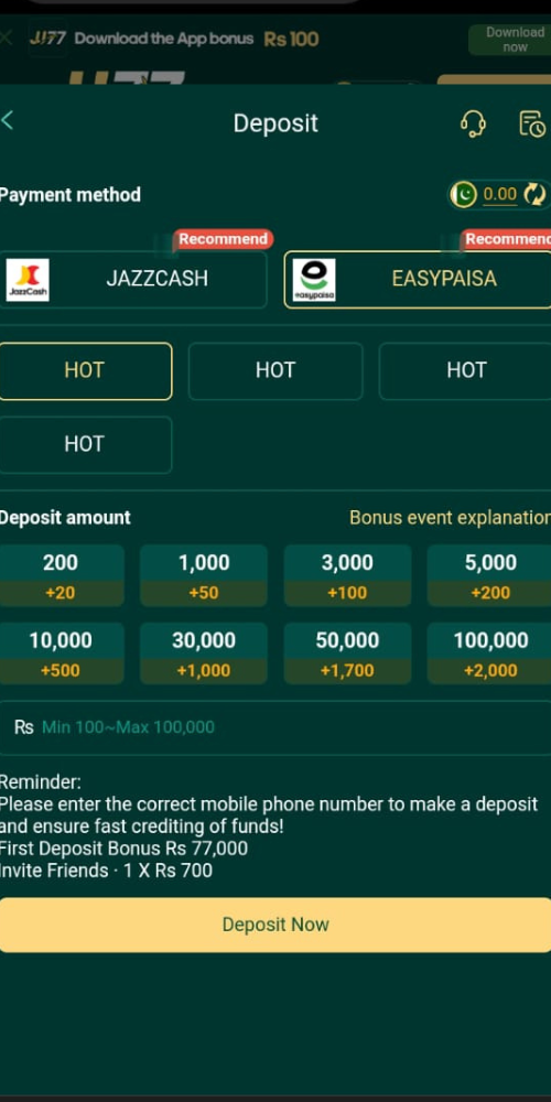 The deposit process is straightforward and usually credited instantly to the JJ77 App wallet.